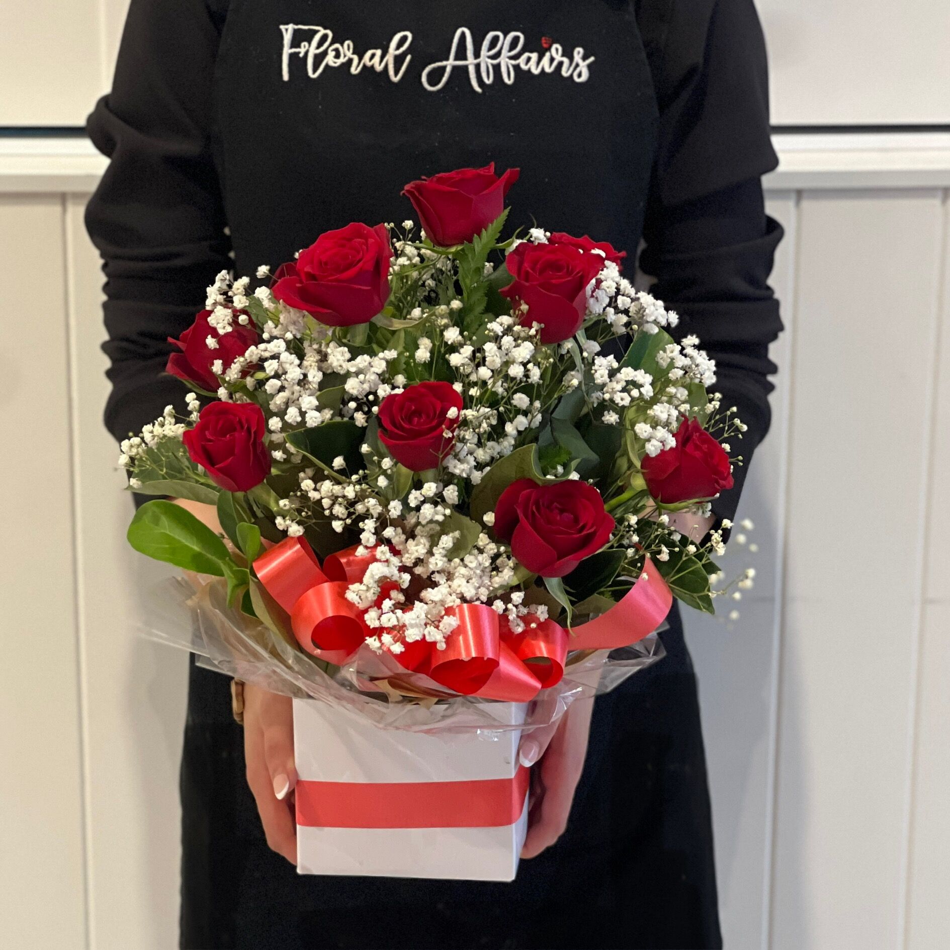 10 freshest roses in a box arrangement with foliage and babies breath.