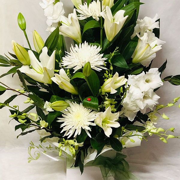 A tall arrangement of white oriental lilies, white orchids and white seasonal flowers. Pictured is the standard size option.