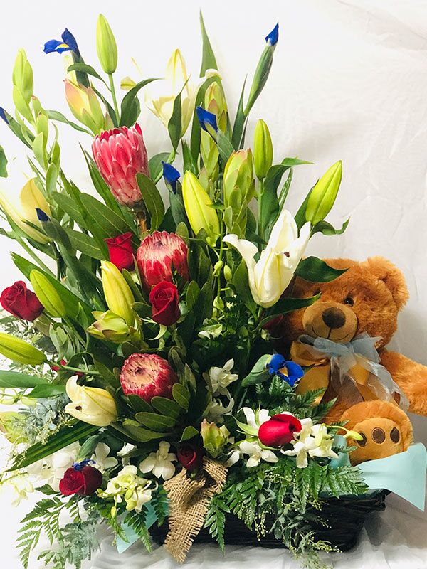 An extra large arrangement with red roses, blue iris, white oriental lilies, white orchids, Australian natives and tropical foliage, set in a basket with a teddy
