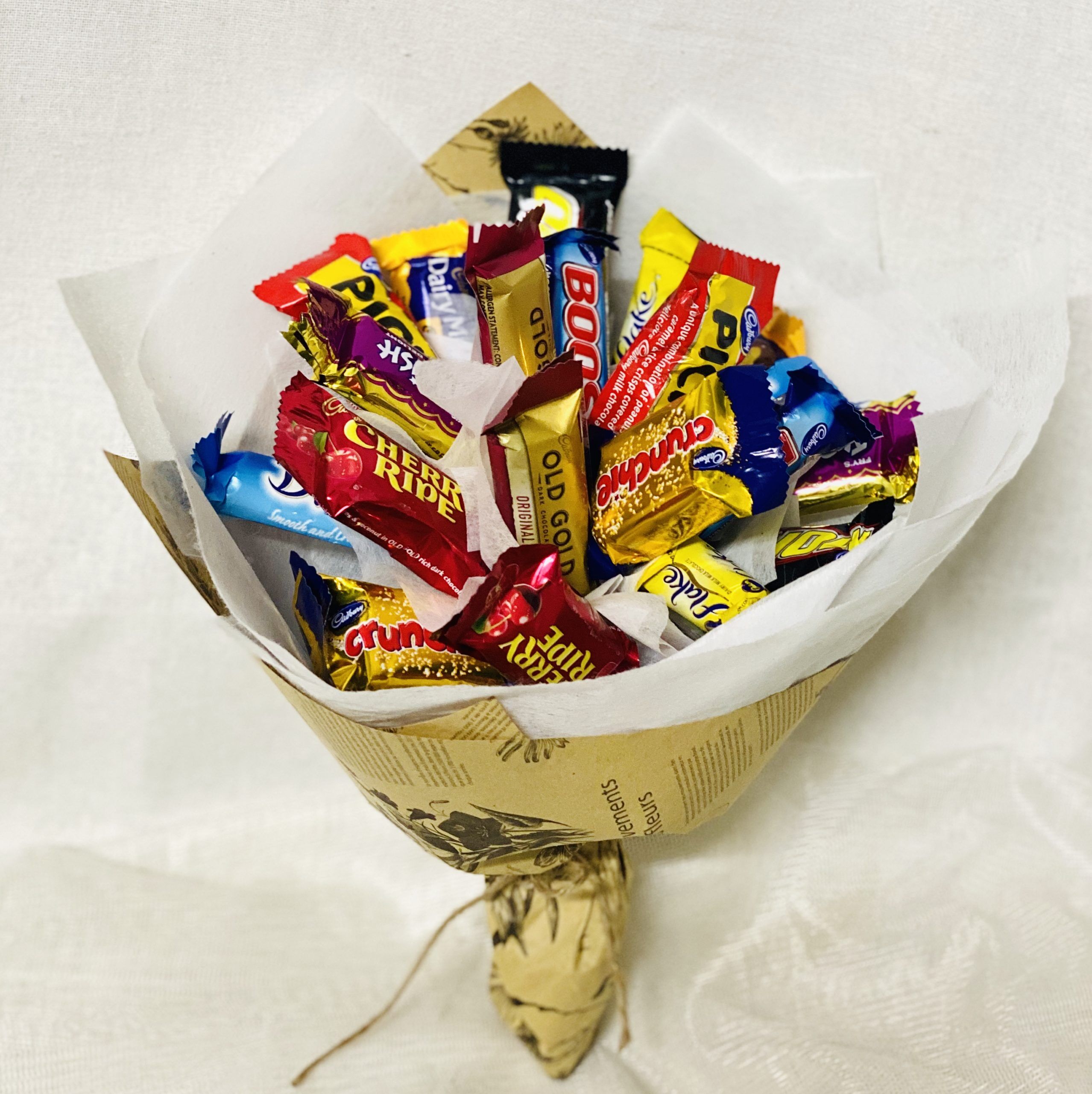 Our Chocolate Bouquet is crafted with 20 Cadbury Favourites fun size chocolates. Pictured is the standard size. Premium and luxurious size options are also available. The premium size has 35 chocolates and the luxurious had 40 chocolates. Always wrapped to perfection.