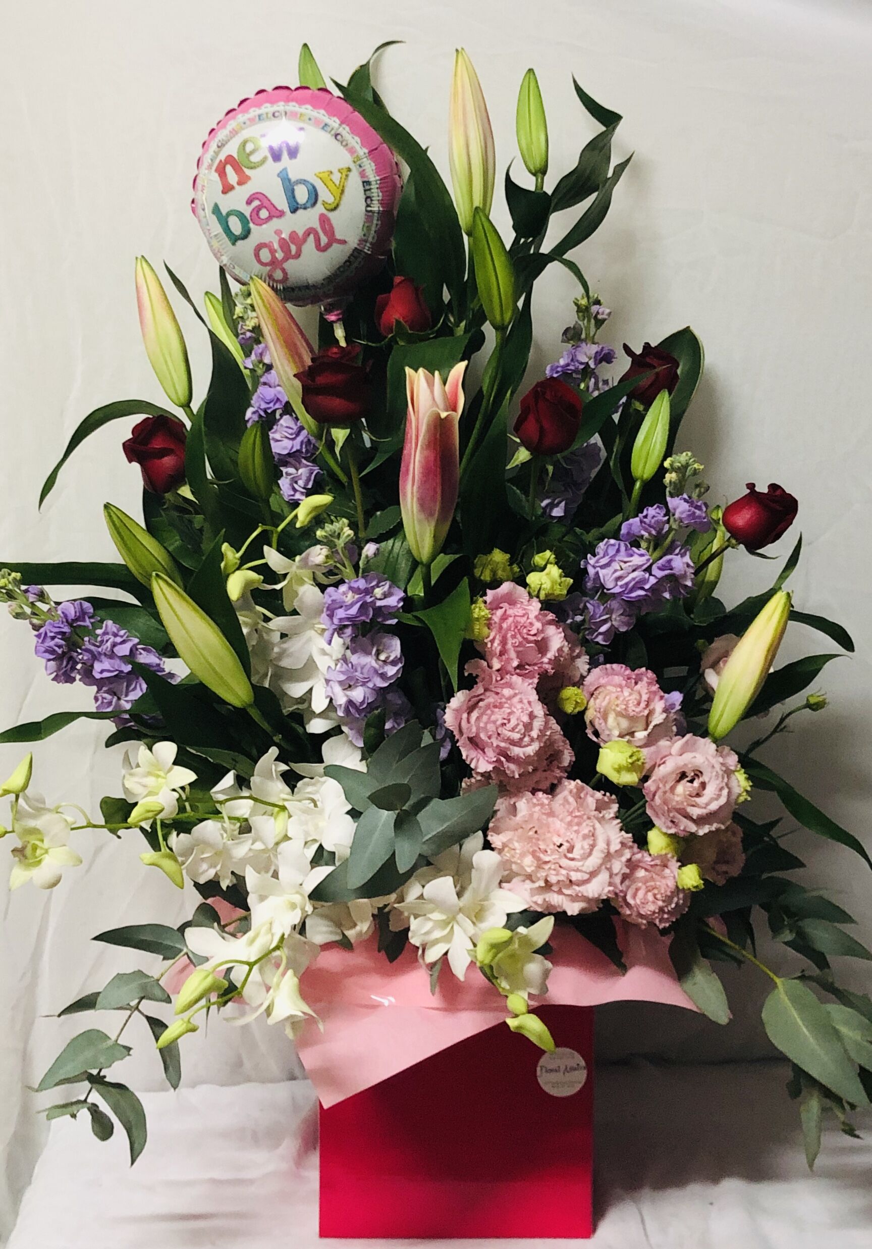 A tall one sided arrangement with premium seasonal blooms including lilies, roses, stocks, lisianthus and orchids with balloon and complimenting foliage, made to welcome a baby girl or boy