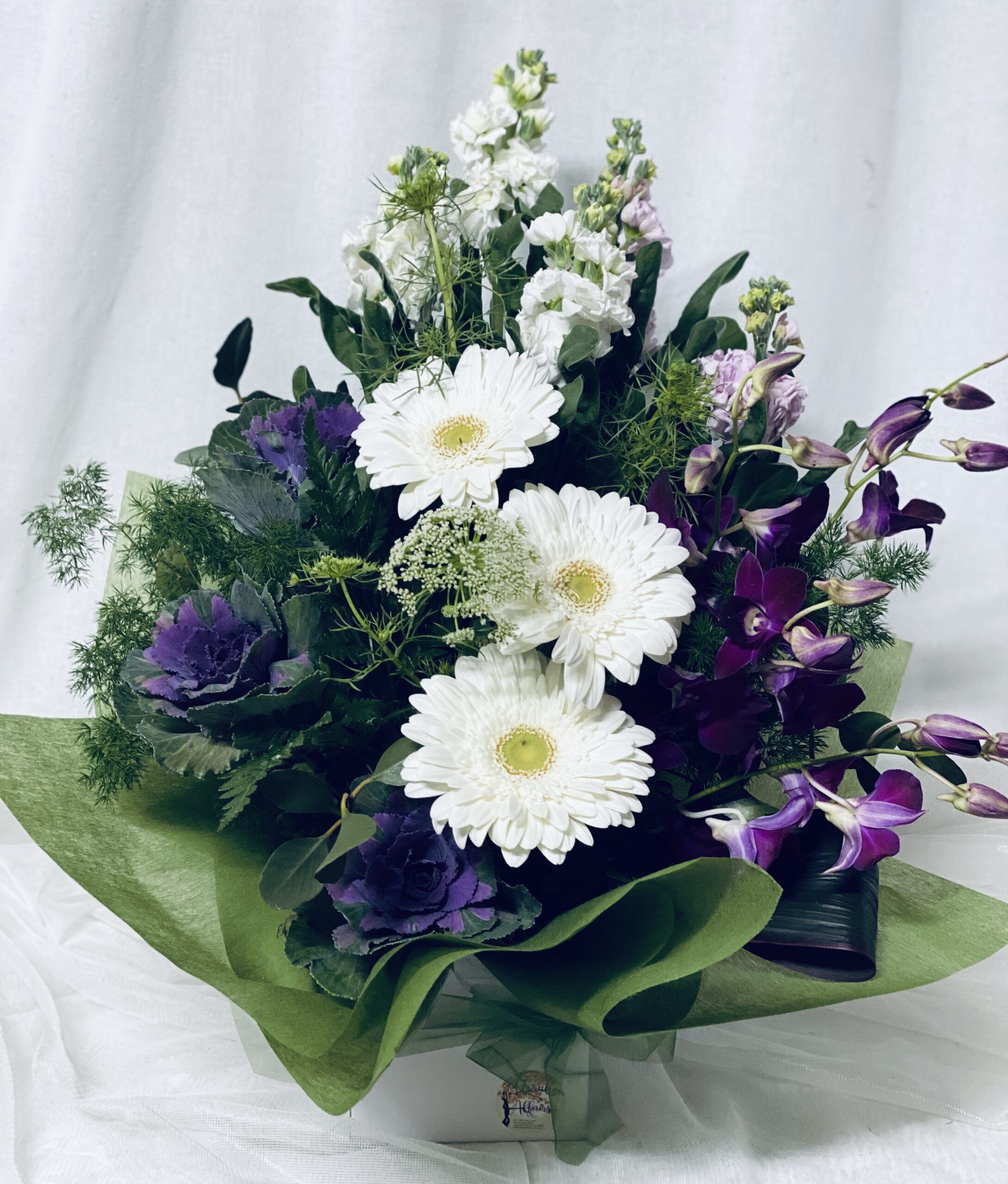 A box arrangement with purely whites, mauves and purple seasonal blooms with complimenting foliage. Pictured is the standard size.