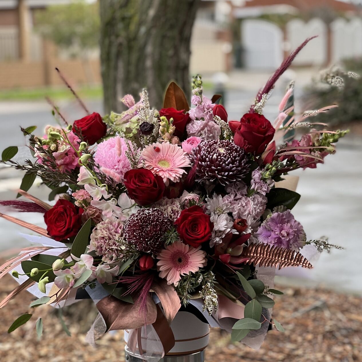 | A designer style hat box arrangement with a compact composition of red, pink and burgundy seasonal flowers. Modern, unique and one of a kind with fresh and preserved complimenting blooms. Guaranteed to impress for Mother’s Day or special occasion.