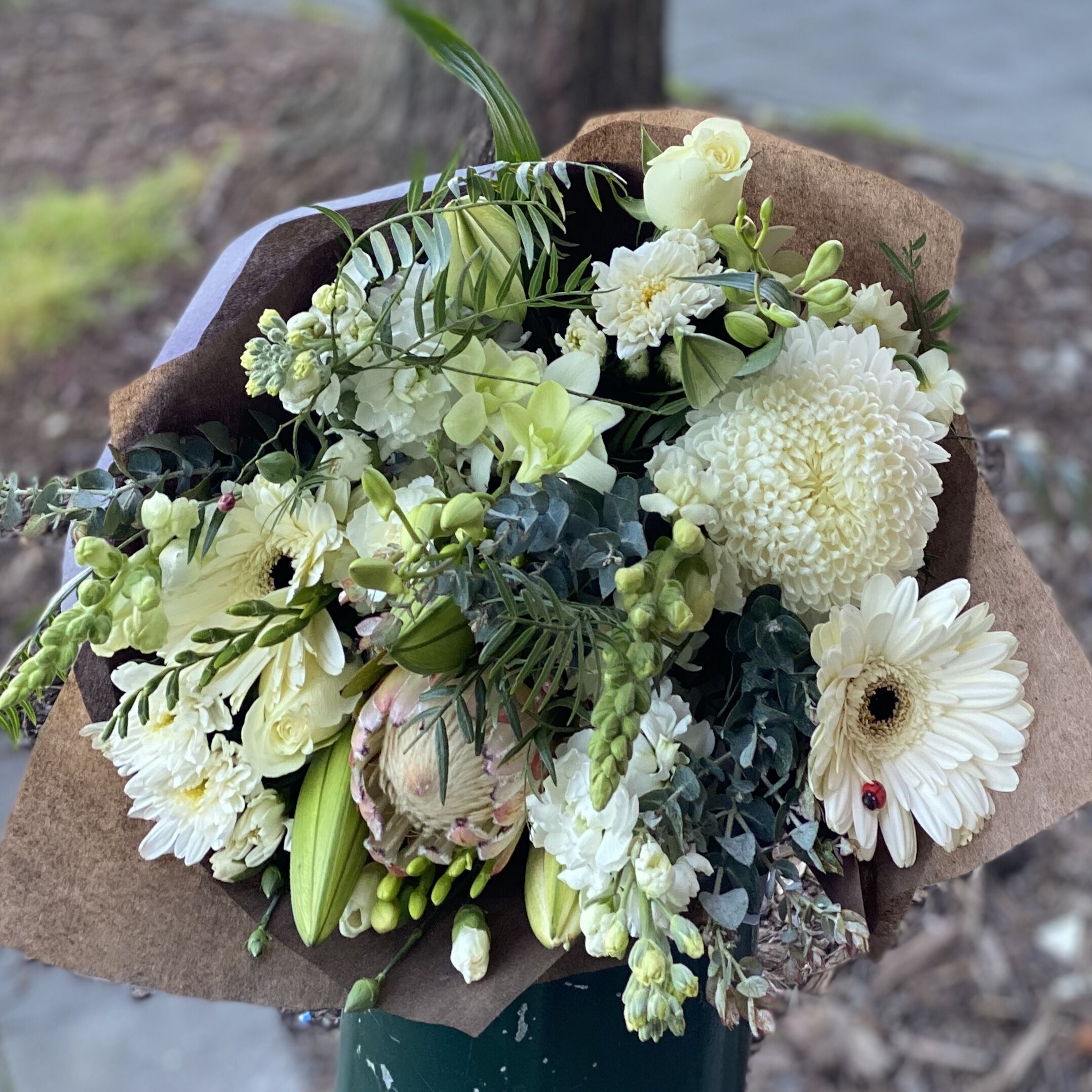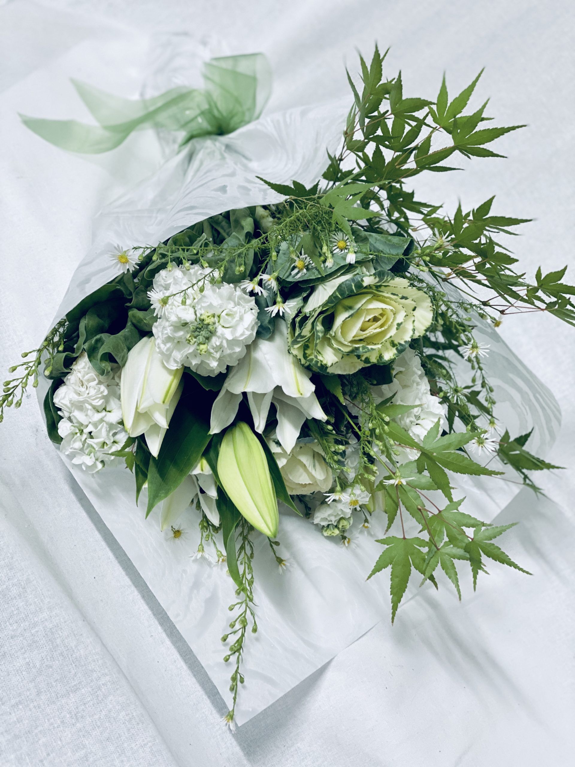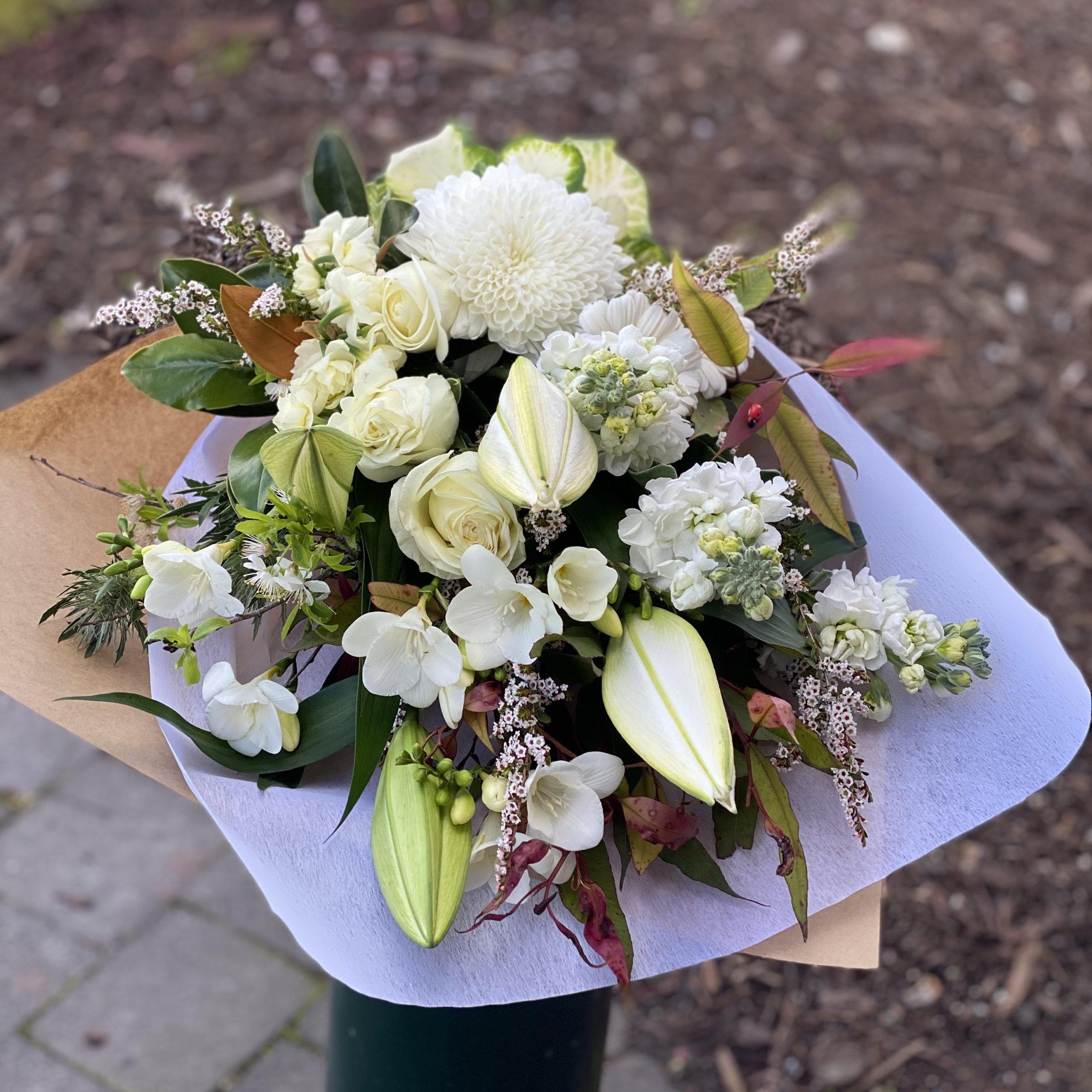 A selection of seasonal white blooms including scented oriental lilies, stocks and kale with complimenting foliage