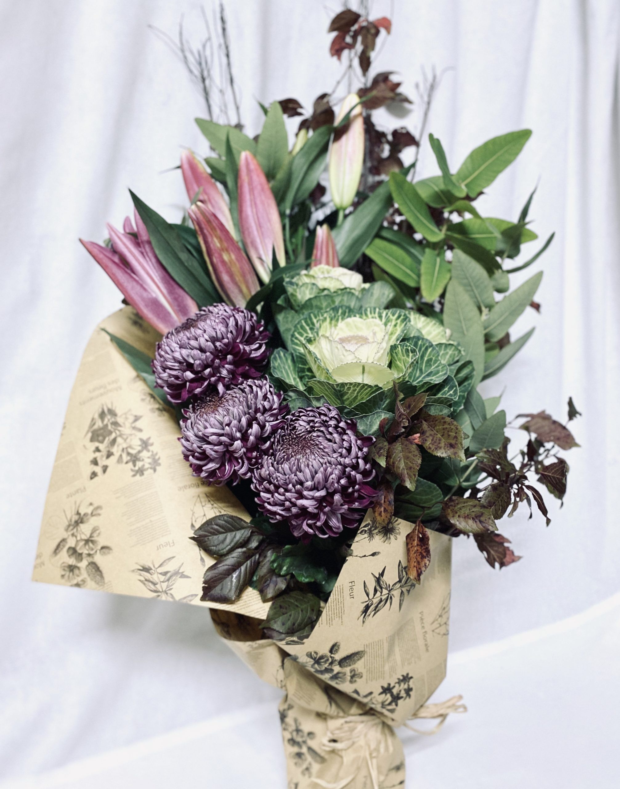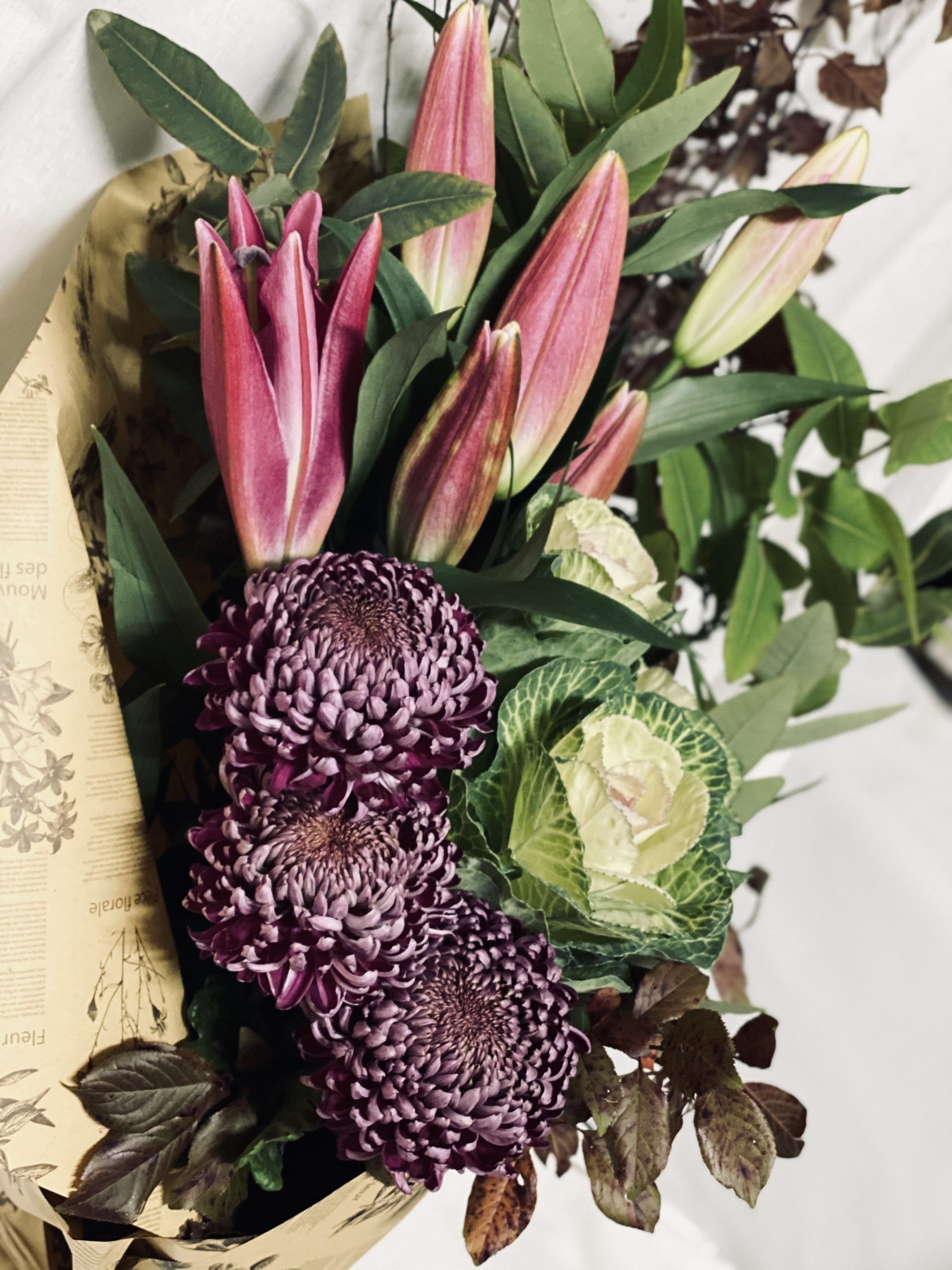 Hot pink oriental lilies with kale, Mother’s Day pompoms and classy complimenting foliages. Perfect to fill mums tallest vase!
