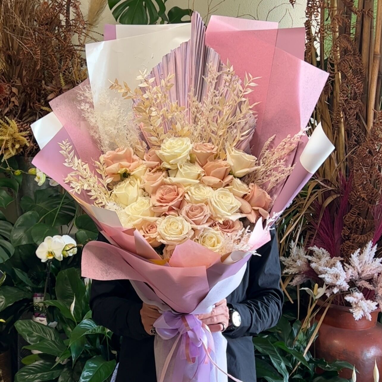 Large grand lavish bouquet with pink and white premium roses and giant preserved palm and everlasting blooms. Superbly wrapped for lavish gifting.