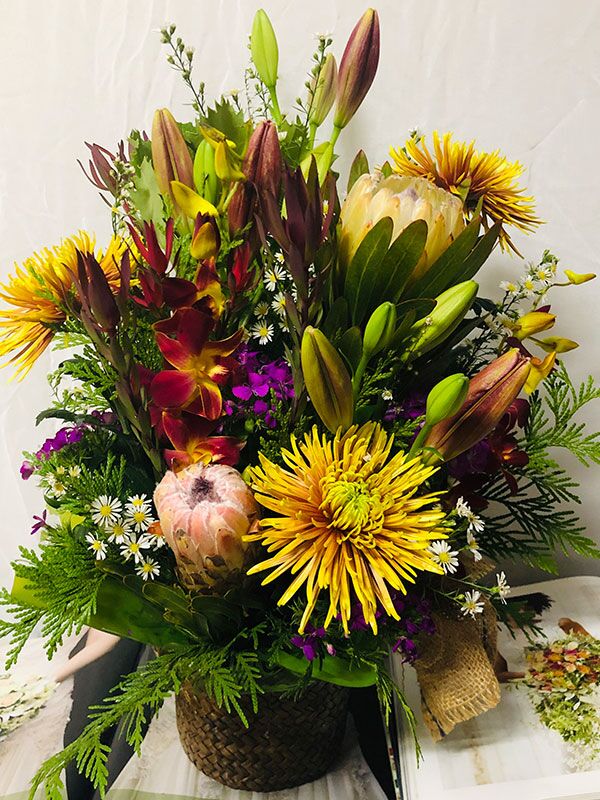 Australian natives with a bright selection of seasonal blooms including lilies, disbuds, orchids, daisy and complimenting foliage. Pictured is the luxurious size option.