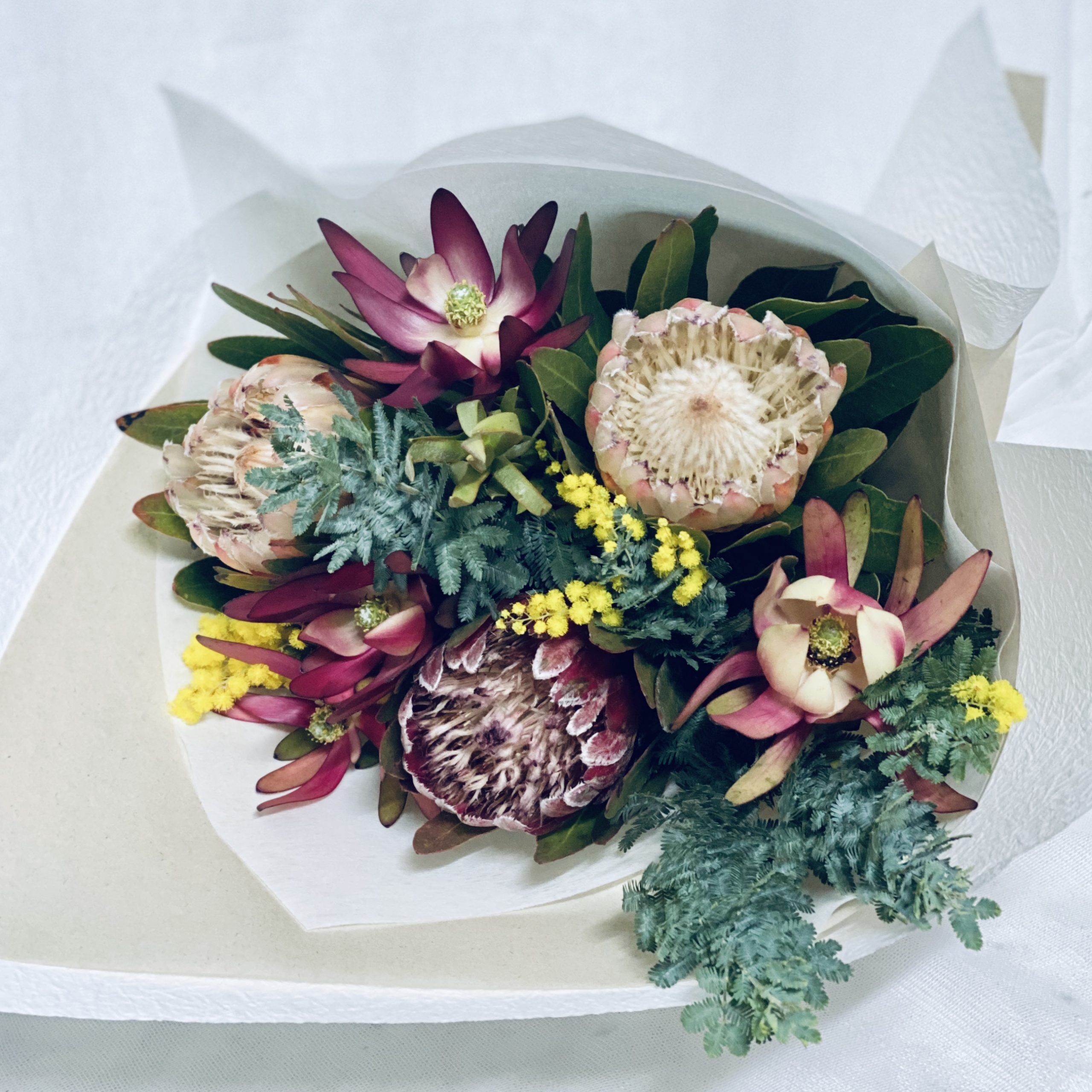 A classic bunch of long lasting Australian natives and complimenting foliages. pictured is the premium size.