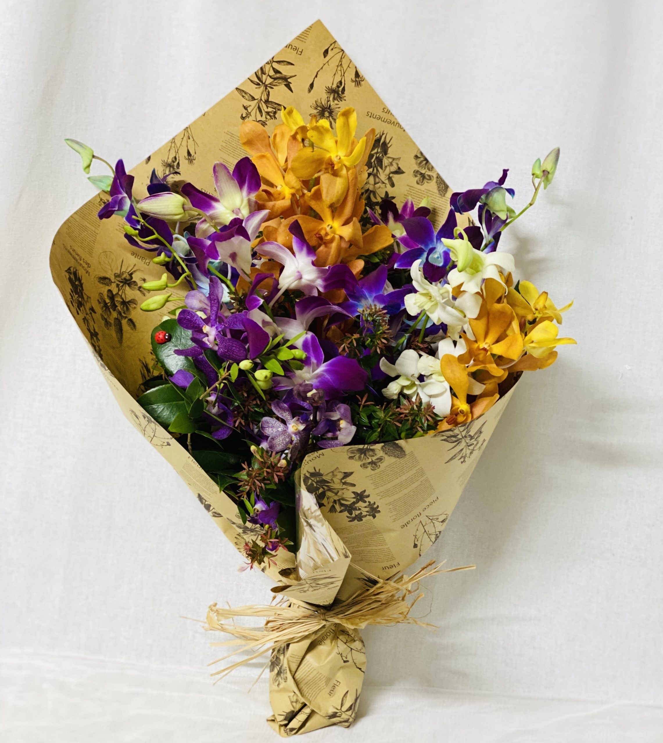 A delicate bunch of orchids with complimenting foliage, available in most colours of the rainbow