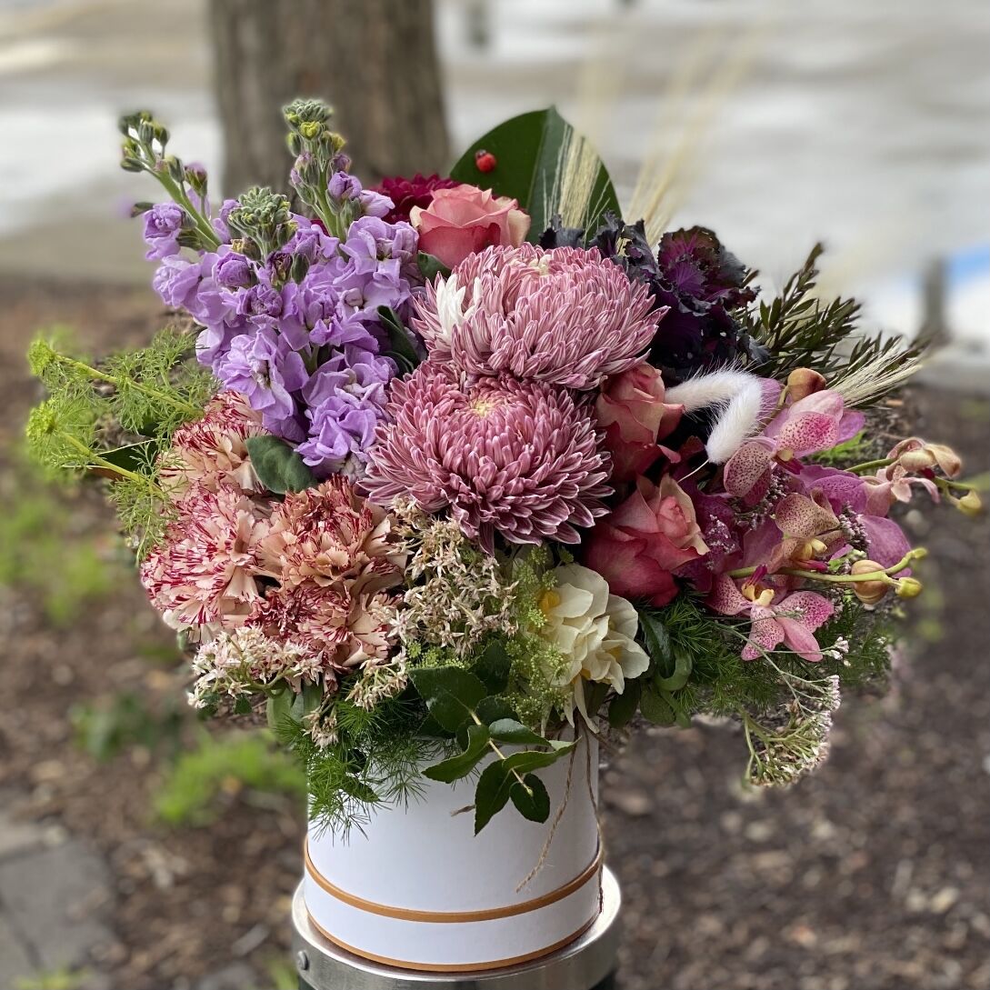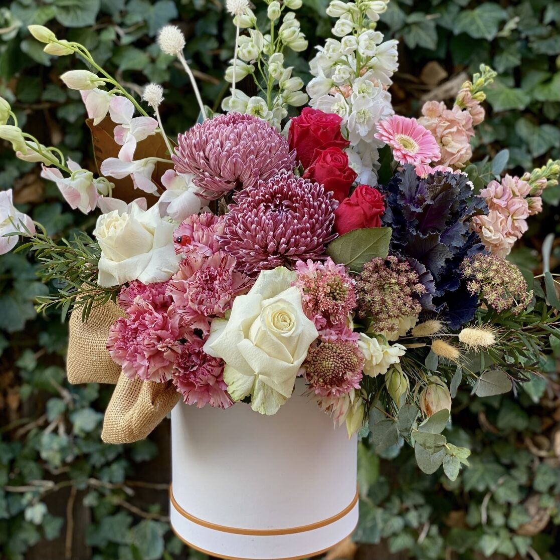 A selection of the freshest seasonal flowers in subdued blush hues including large pompom disbuds and roses; arranged perfectly in a hat box. Seasonal variation may change but the designer creativity will not. Pictured is the standard option. Second and third photos are of the premium and luxurious options. Add order notes if you would like specific colours. Hat box sizes are small ( standard), medium (premium) and large (luxurious).