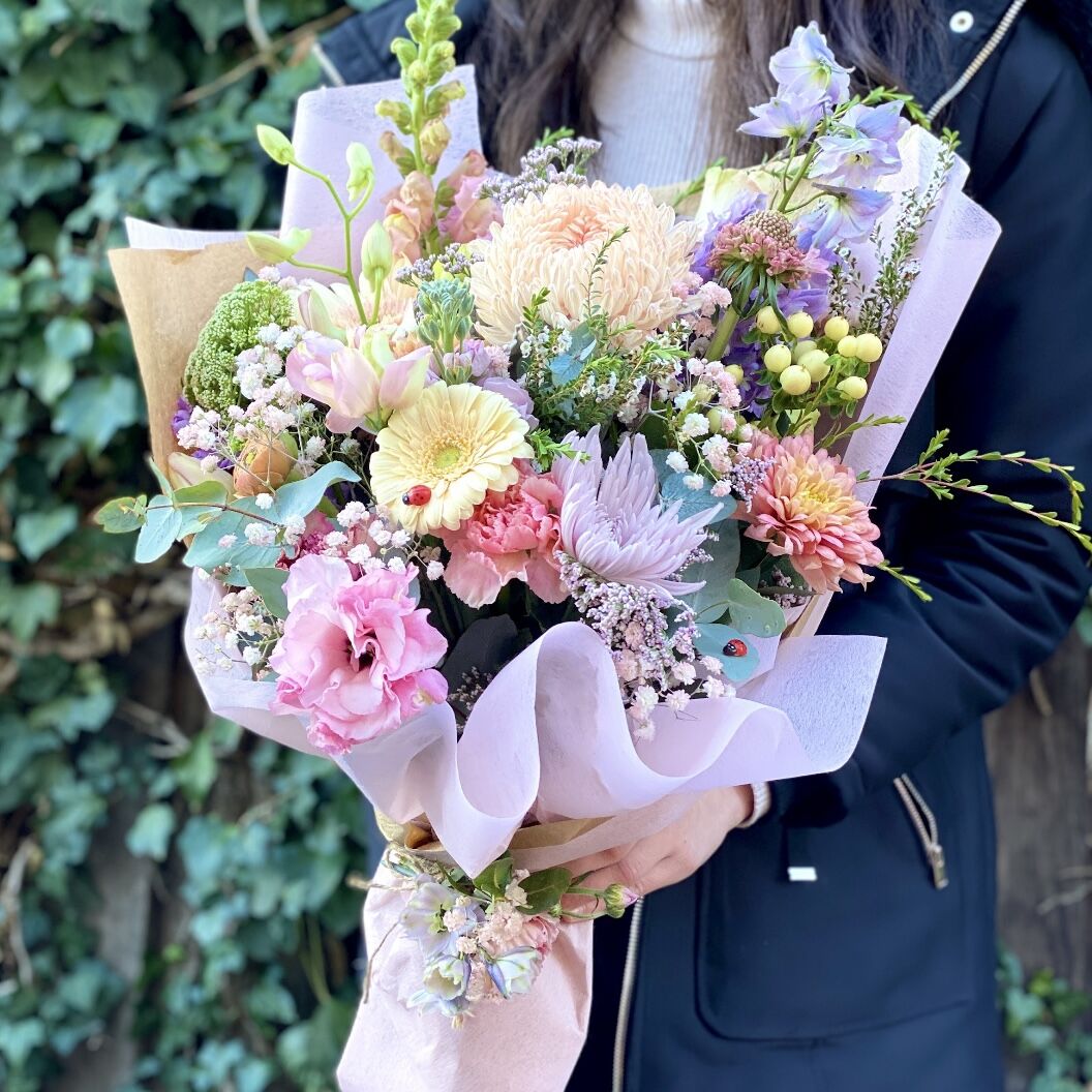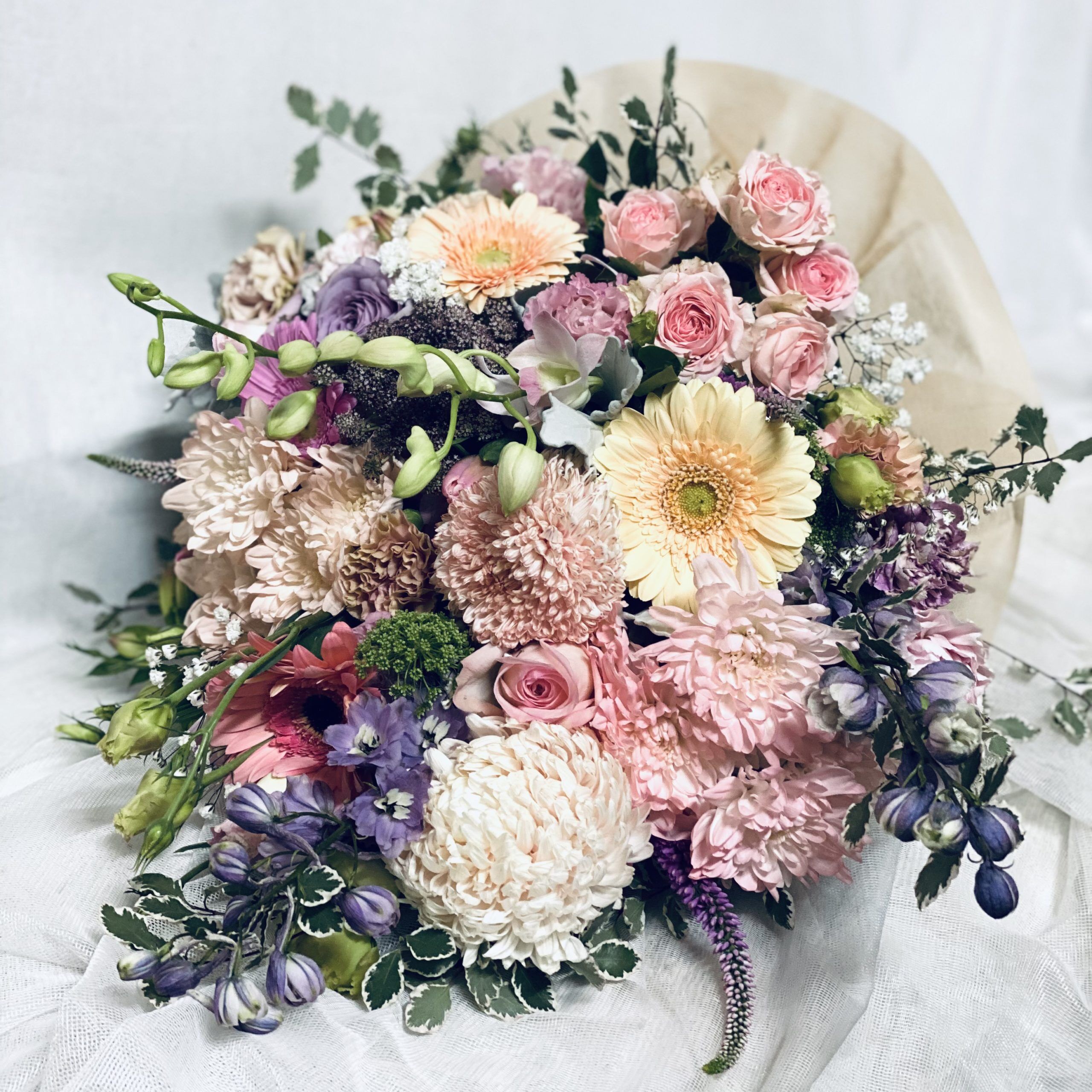 Pretty pastel bouquet with seasonal blooms. Vase not included. Pictured first is the luxurious option.