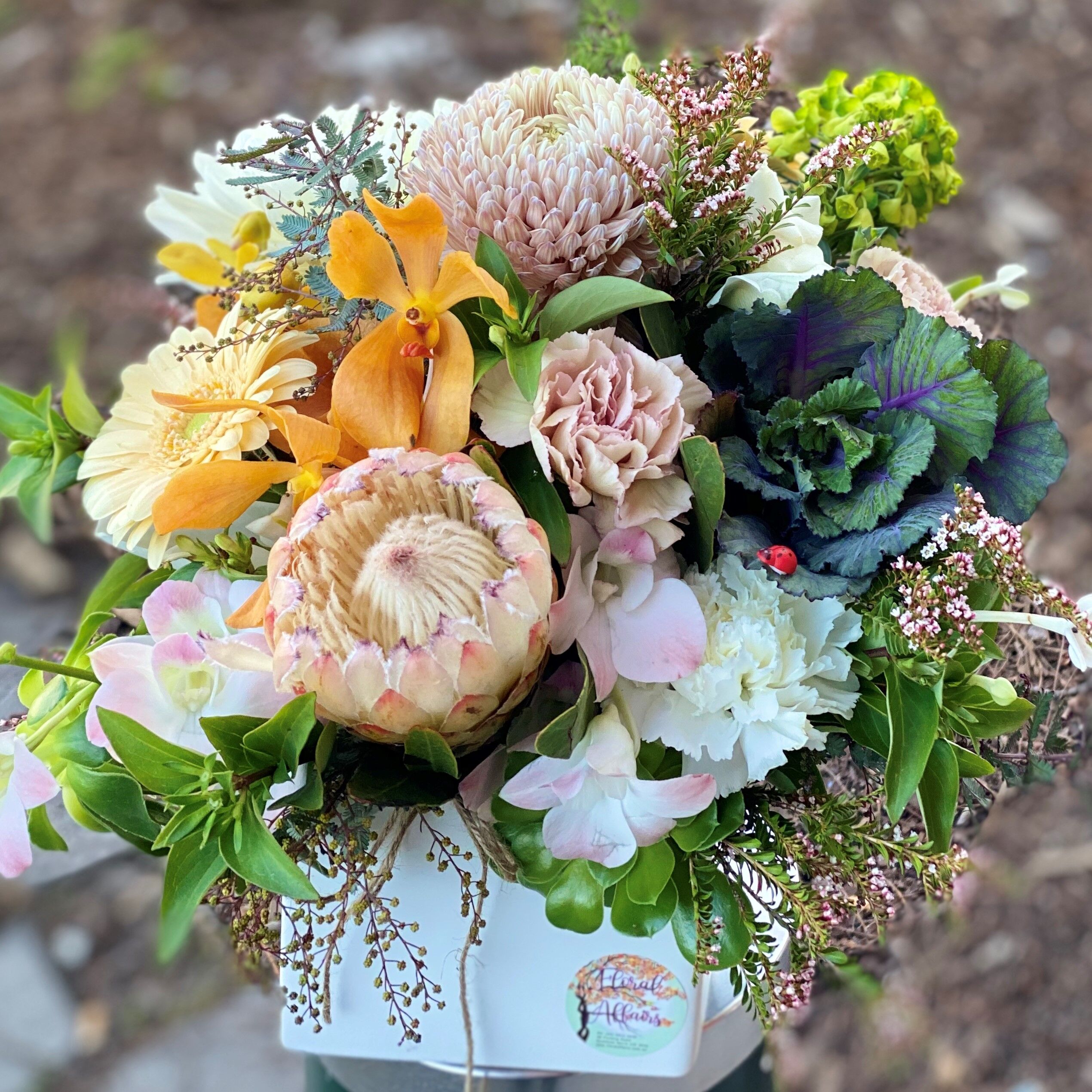 A stunning arrangement of seasonal pastel, nude and peach blooms in a white ceramic pot. Pictured is the luxurious option. However, all size options are beautiful and are arranged in the same size square ceramic.