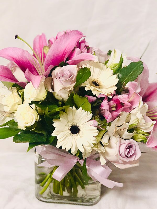 A short arrangement of seasonal pink, white and mauve blooms in a short cube vase