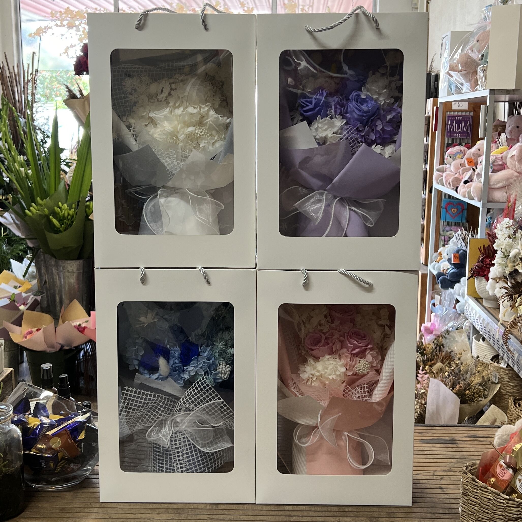 Choose from a red, soft pink or white preserved bouquet. Please note that all colours come with a teddy bear and chocolates as displayed in the first photo.nPlease leave order notes for your colour preference.