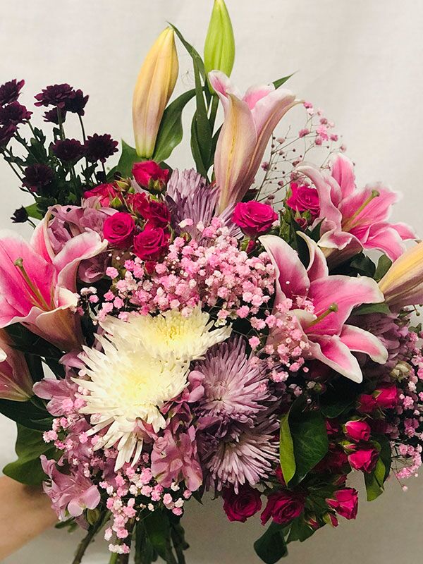 A big bouquet with oriental lilies, disbuds, chrysanthemums and complimenting foliages in a pink, burgundy and white colour theme.