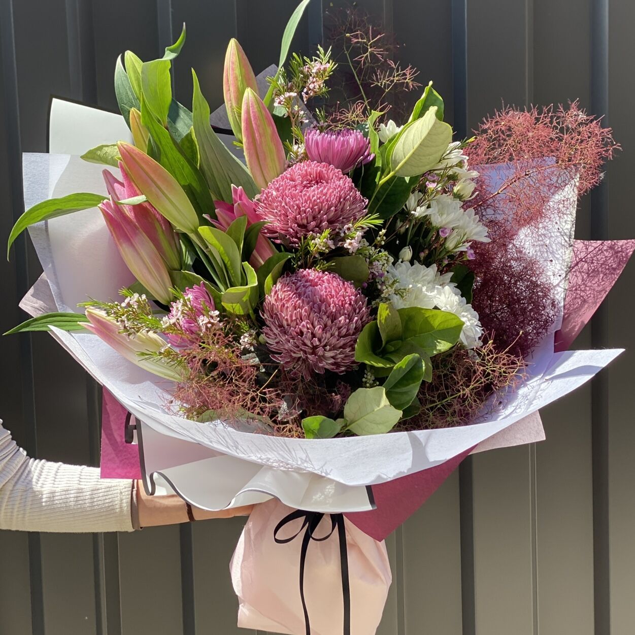 A big bouquet with oriental lilies, disbuds, chrysanthemums and complimenting foliages in a pink, burgundy and white colour theme. Pink gyp is the luxurious option.