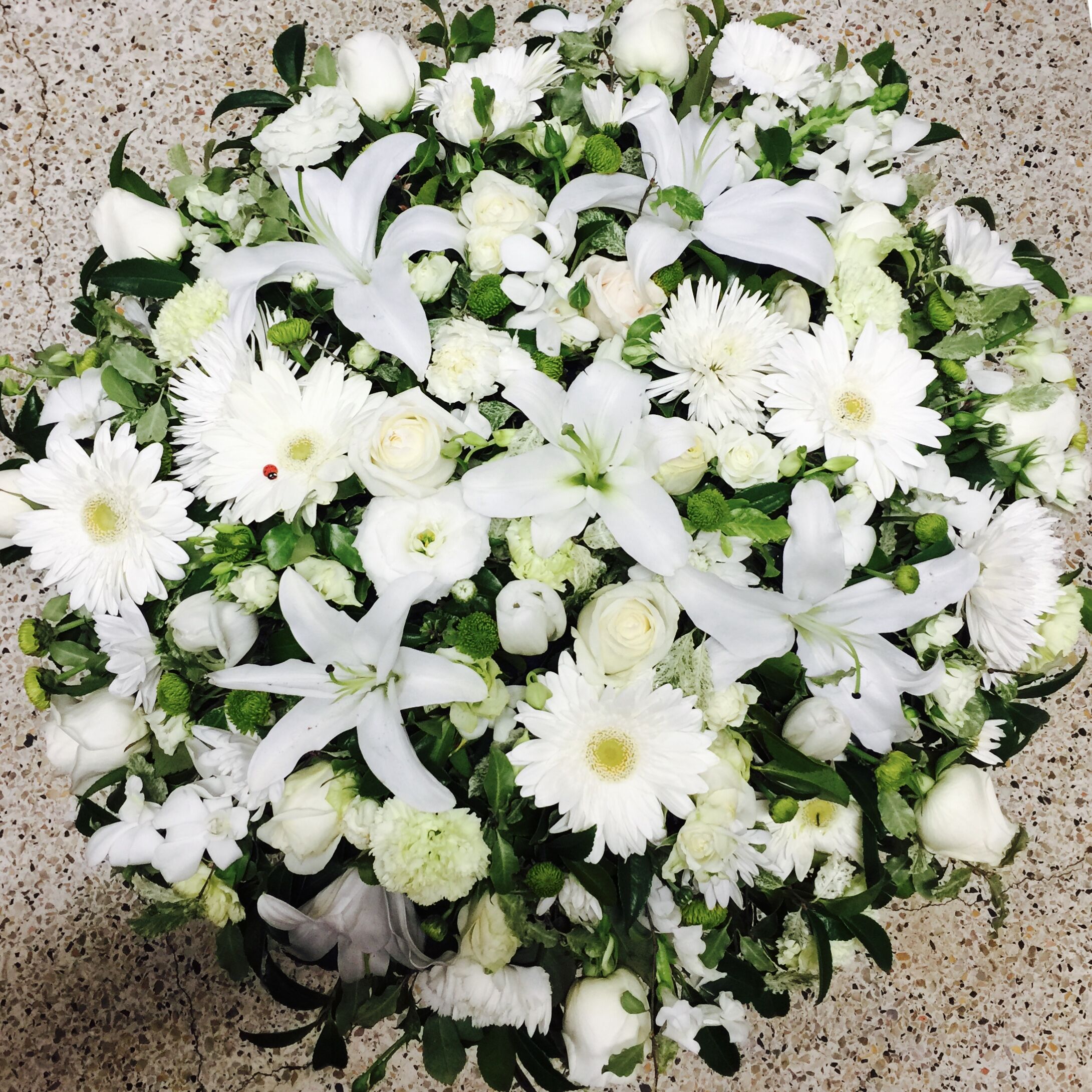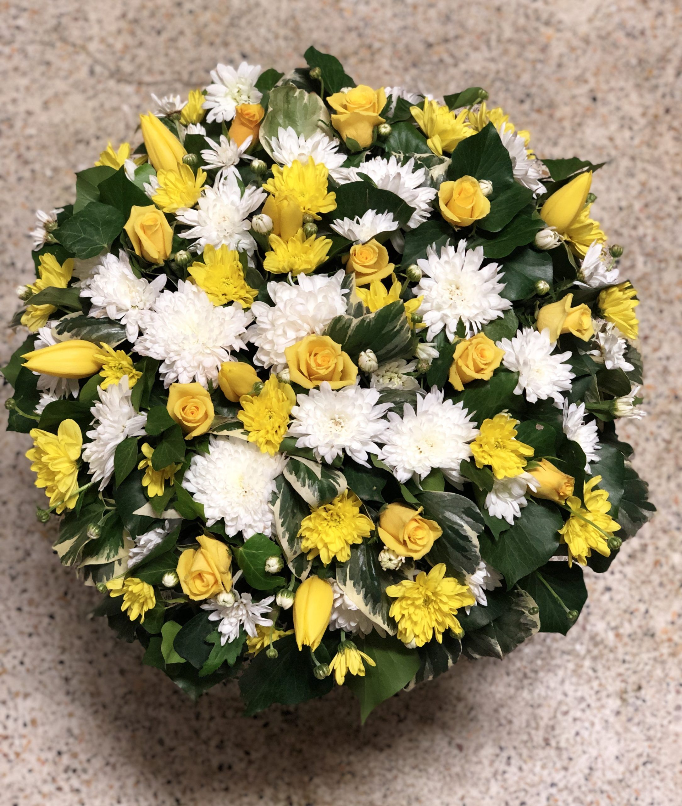 | A large round wreath with a selection of quality seasonal flowers in colours of your choice, approximately 50-70cm |