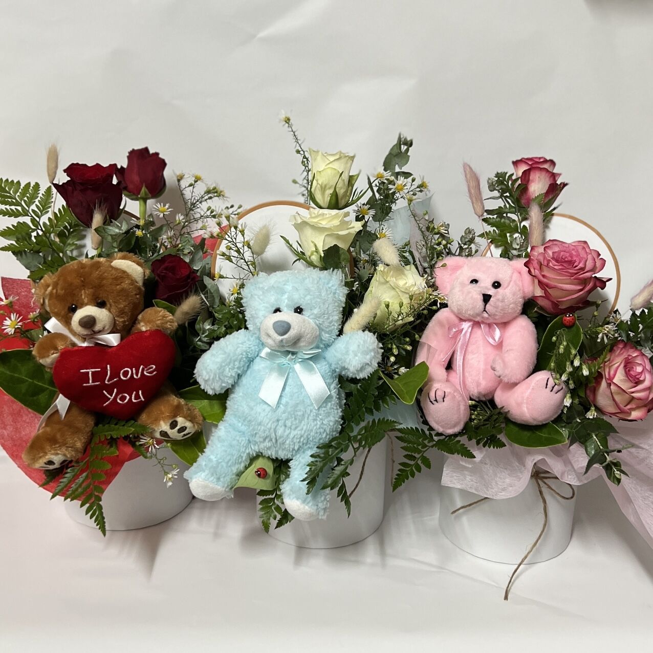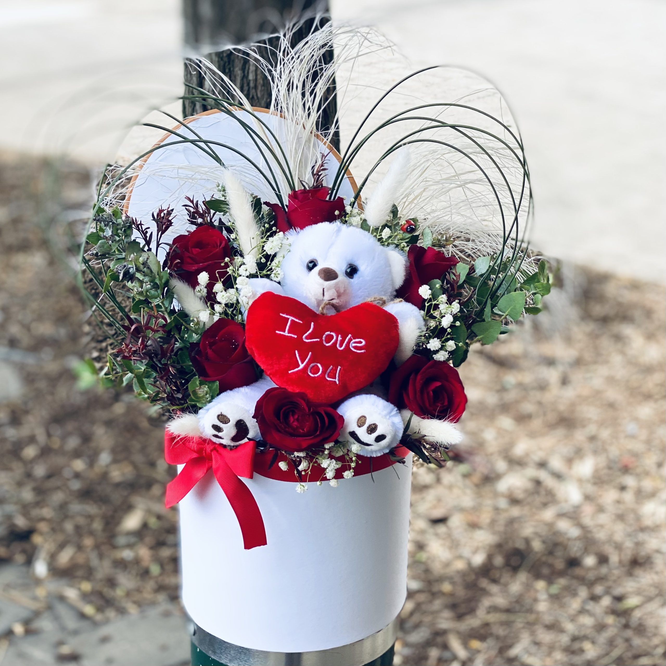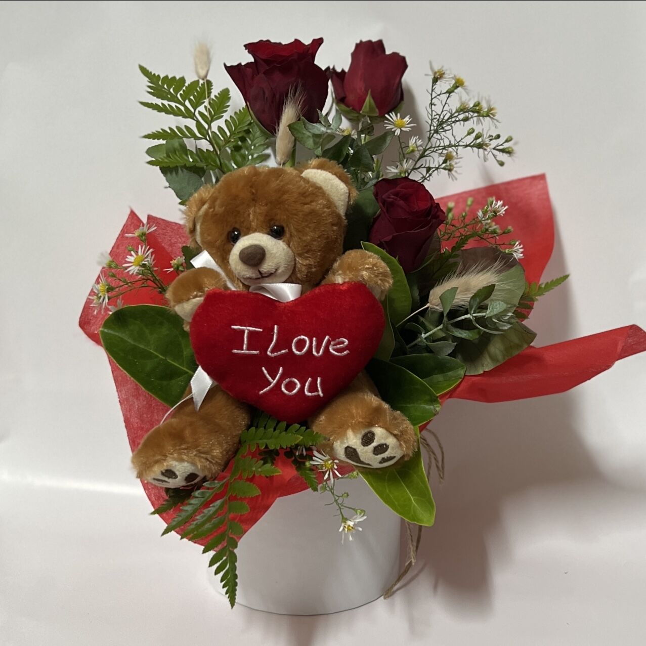 Choose either 3 red roses with a teddy bear or 6 red roses with a teddy bear. Both options are set in a round hat box with bunny tails.  The premium option pictured first also includes a love heart spear grass.