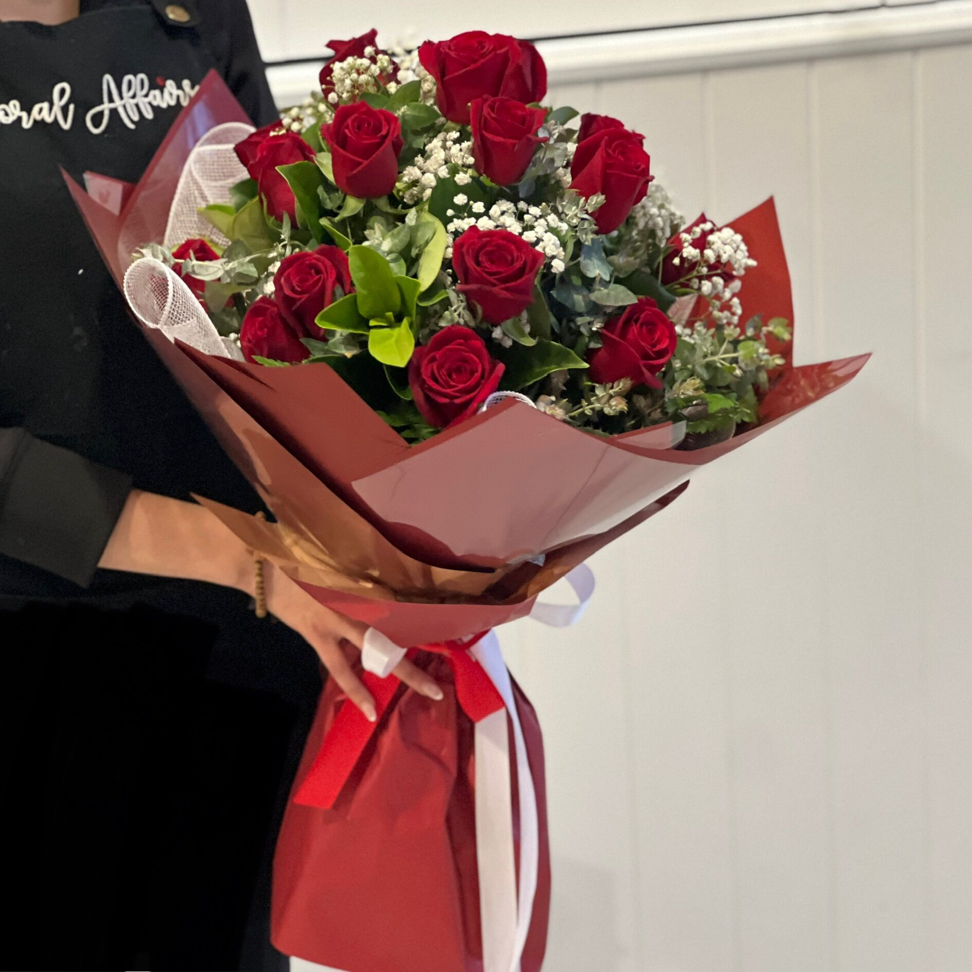 Beautiful Red Rose Bouquet with 20 red roses, complimenting foliages and the fluffiest baby’s breath.